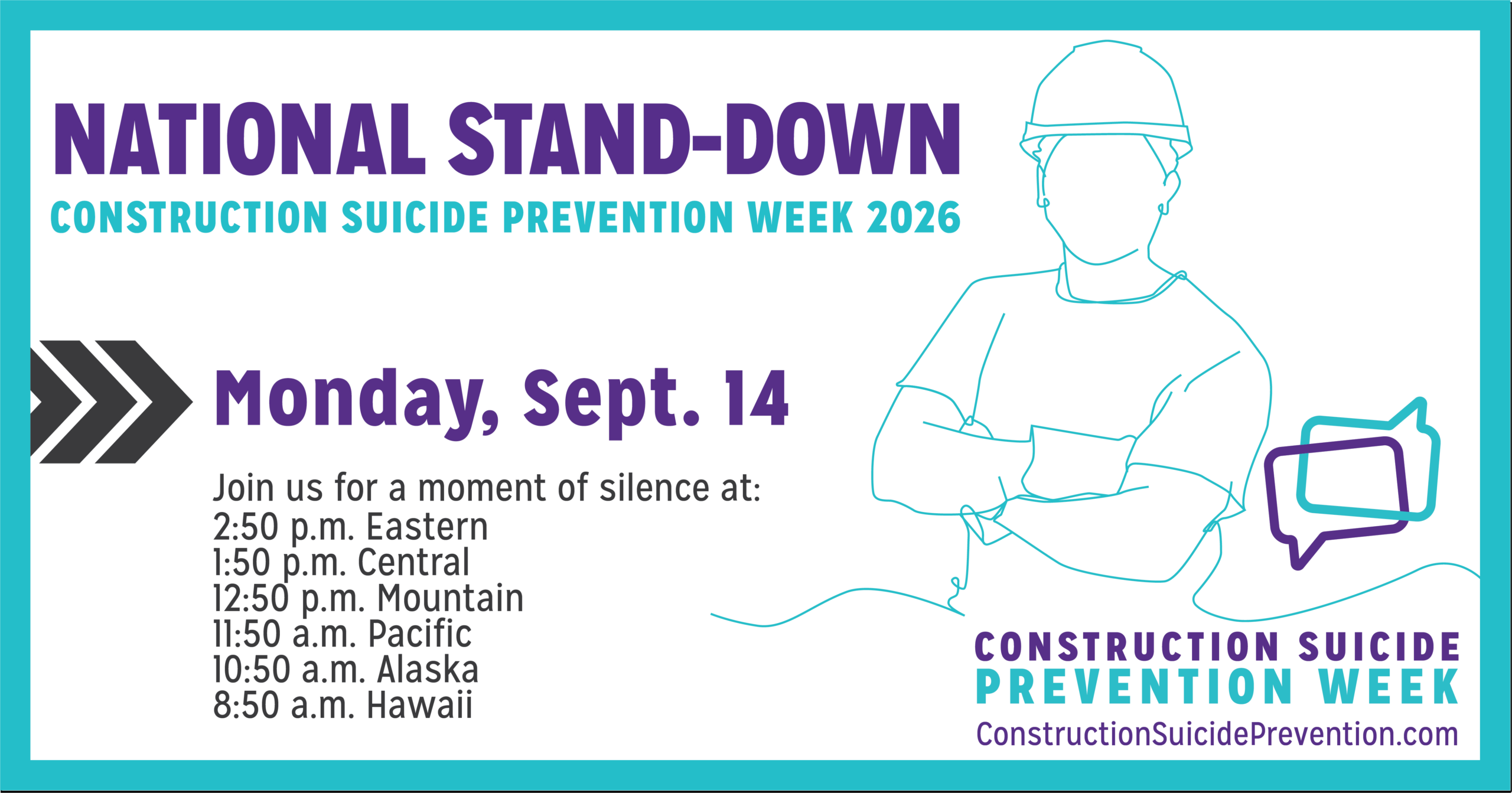 To show your commitment to getting every person home and back to the jobsite healthy every day, join Construction Suicide Prevention Week on Monday, Sept. 14 for one minute of silence during our nationwide stand-down to honor all lives lost to suicide.